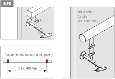 - Kan benyttes til Ø38 mm rør, Ø50 mm rør eller Ø45 mm træhåndlister.