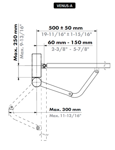 VENUS-A: : Med bøjet arm, hvis monterings stolpen er mere end 50 dog max 250mm forskudt fra lågen. Kan Både trække lågen til sig og skubben den ud af. Indstillinger sættes i App.